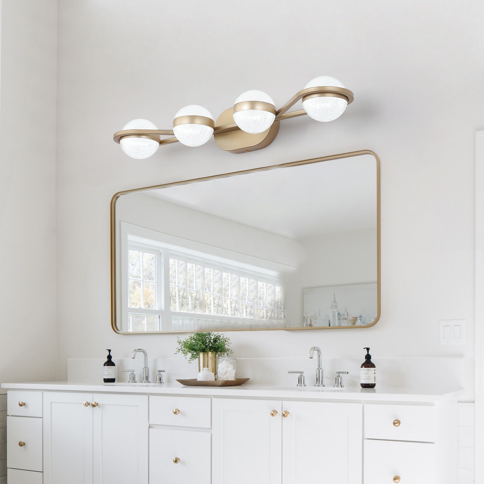 [MODERN&ELEGANT DESIGN]:Premium Transparent Lampshades more brilliance to your life,simple and luxurious design makes it durable decoration for your home.Inspired by a playful slingshot toy, each fixture features globe lights in a fun Mid-century Modern arrangement.[APPLICATION]: 4 Lights bathroom Vanity Lighting. Modern and simple style design, suitable for your bathroom, mirror cabinets,powder room, bedroom and living room etc. Modern vanity light brightens your living instantly.[ENERGY SAVING]:LED Light Sourcecreates stable and efficient light.LED technology saves up to 80% electricity[Finish]: Champagne Gold [Height centre of Wall Opening]: 2.6 Inch [Material]: Acrylic [ Average Hours]: Integrated soft white (6000K) light