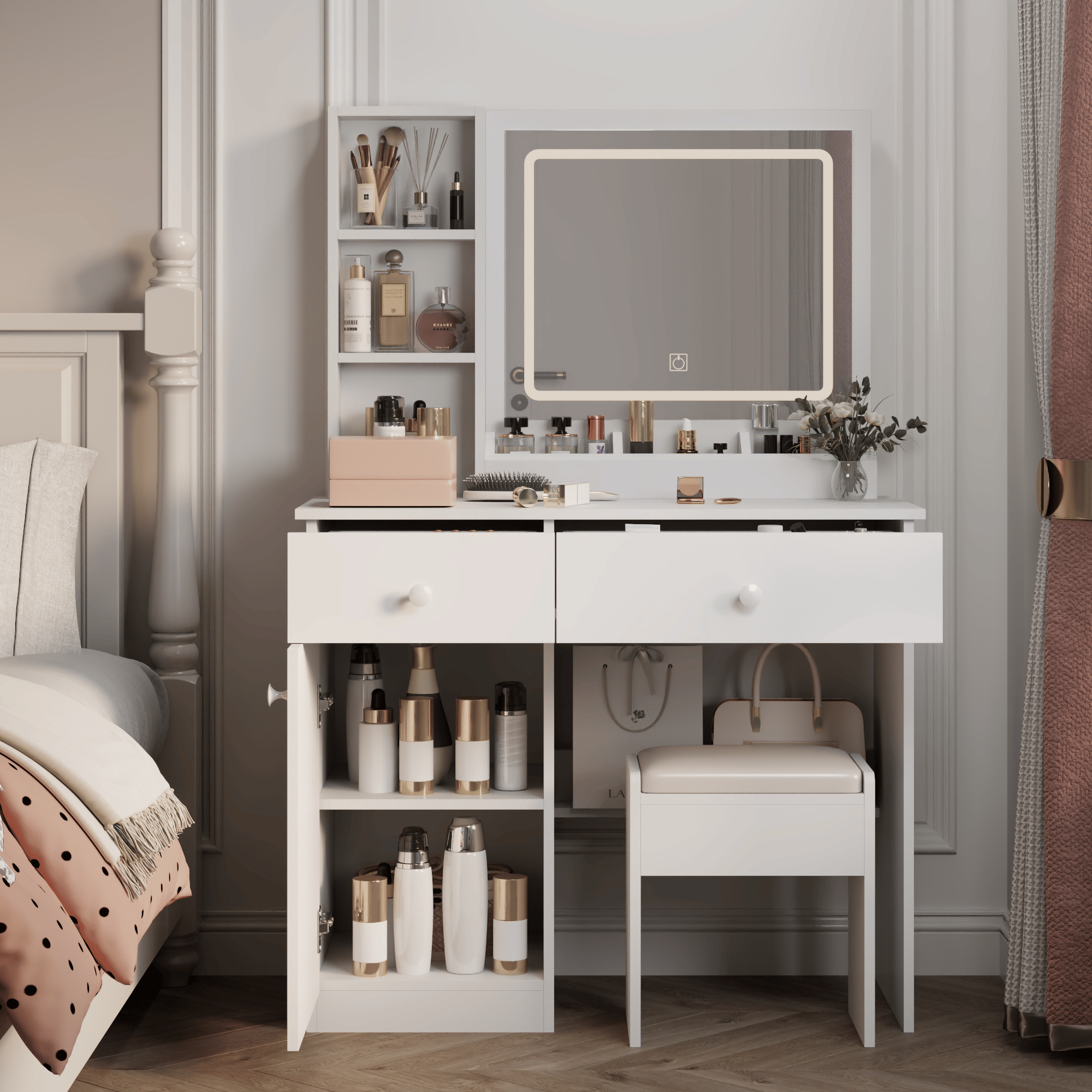 Quality and Durable: Scientific and stable design structure, plus eco-friendly Medium Density Fibreboard material guarantee the stability and sturdiness of this makeup table and chair.Large Mirror and 3 Color Lighting Options:The makeup table is equipped with a large mirror, reflect your appearance more clearly and realistically from all angles. The LED Mirror have 3 color light modes: warm yellow, warm white and cool white, and the brightness of each color can be adjusted. Meet your needs for different environments and makeup looks, allowing you to enjoy makeup experience like a star.Multiple Storage Space:This large makeup vanity will be your perfect choice to say goodbye to clutter. The spacious table top, muti layer drawers, table top shelf, and side storage shelves and Sliding mirror glass door can hold all your cosmetics and other beauty essentials, making everything look organized.Stylish and Elegant Design: Classic atmosphere retro as well as the glass door design of the side storage shelves, make this vanity desk charming. It suits any room decor and exudes sophistication no matter where it is placed in the room. So this lighted vanity table will be an ideal gift for yourself or your loved people on birthdays, Valentine's Day, Mother's Day, Christmas or other anniversaries.Easy Assembly:The makeup desk is made of eco-friendly artificial wood . This combination makes it more stable and the service life of the vanity is longer. Comes with detailed instructions and tools, and an installation video is provided, it is recommended to follow the steps in the accompanying instructions, then lay out each board by number, and finally assemble, which saves time