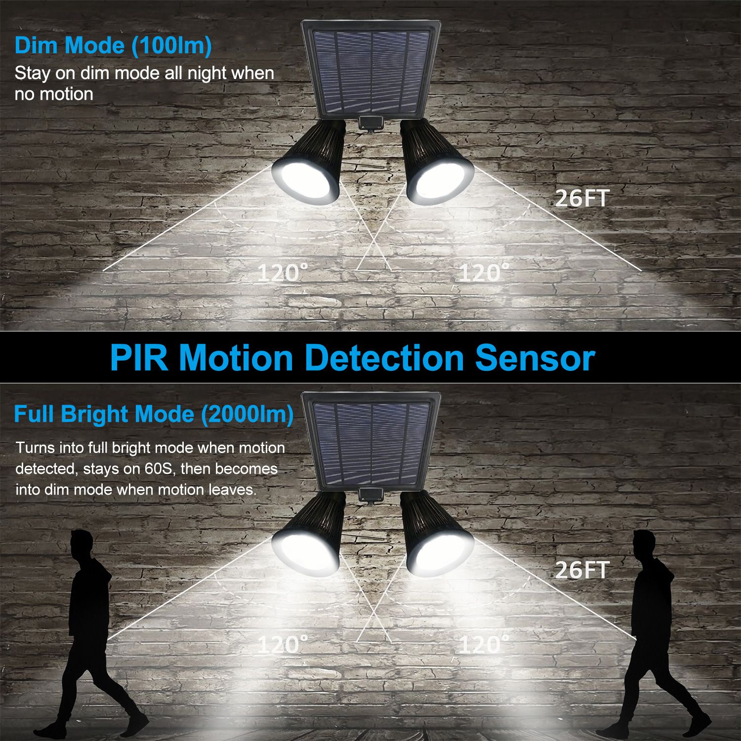 **UPGRADED INBUILT MOTION SENSOR*:Adopts advanced PIR motion sensor offers 120° wide sensing angle can detect people motion up to 26ft.At night,our Solar light auto turns on in dim mode(100lm),then turns into full bright mode(2000lm) when motion detects and stays 60S illumination. The first time use needs to turn on the switch.