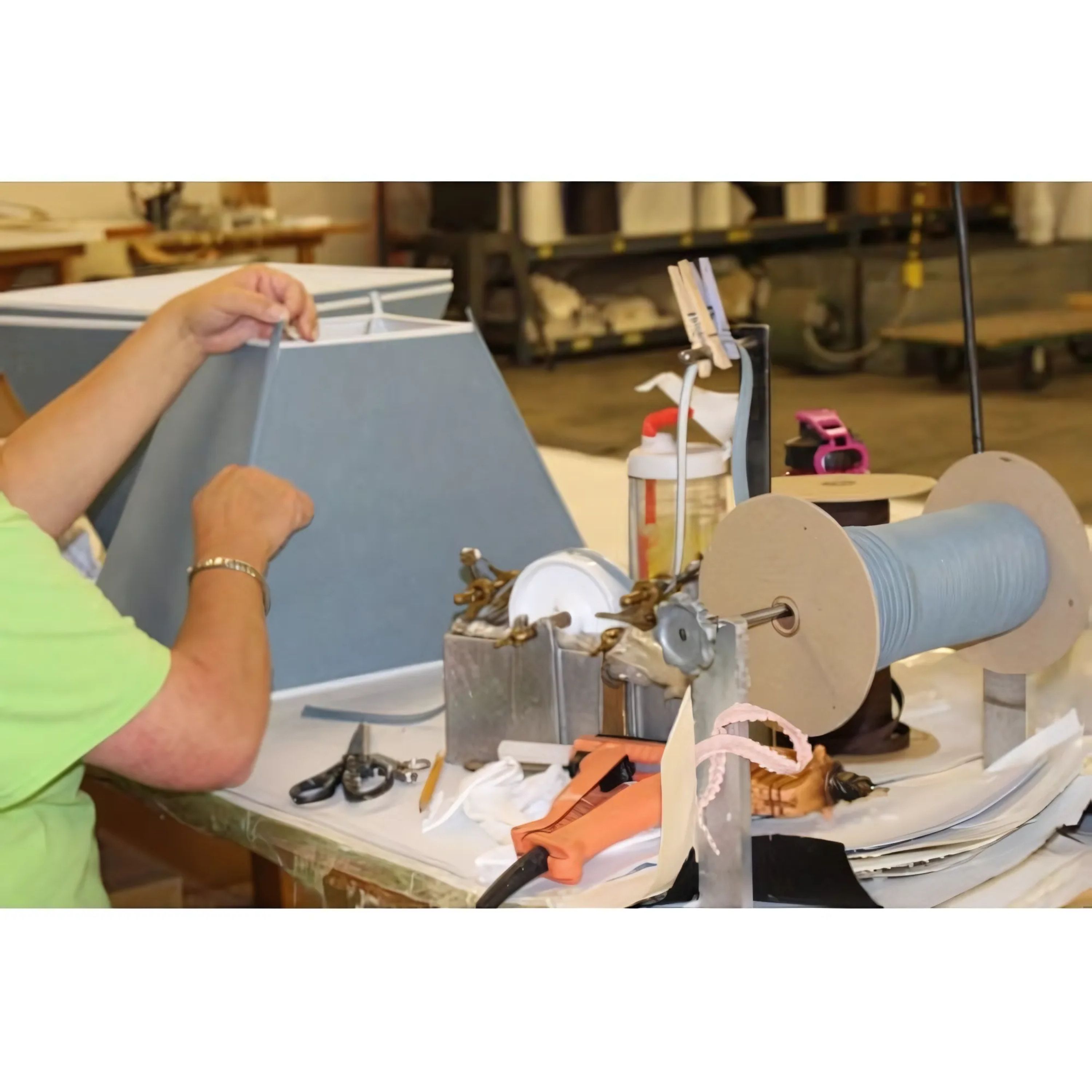 Our lampshade comes with a washer that is made of sturdy metal with a brass finish. The washer fitter with an outside diameter of 1 inch and an inside diameter of 7/16 inch sits on top of the harp and is secured by the existing finial of the customer.