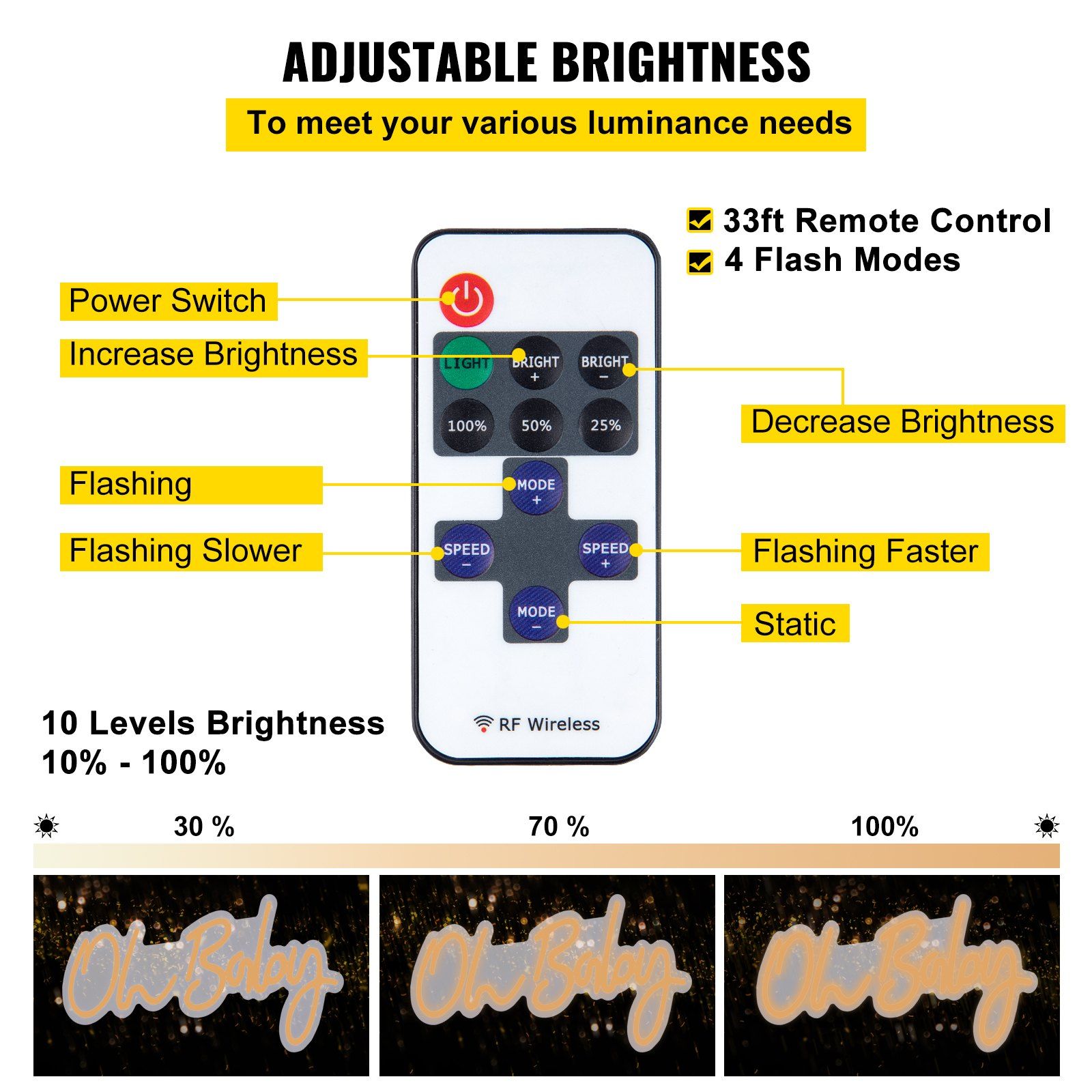 1.4 Flash Modes & Adjustable Brightness: Our neon sign is adjustable via the remote control, press the 'MODE' and 'SPEED' buttons to choose 4 modes of lighting effects, which are slow flashing, medium flashing, fast flashing, and gradient flashing. The brightness can also be adjusted from 10% to 100% according to your various needs. Remote control distance: 33 ft/10 m.