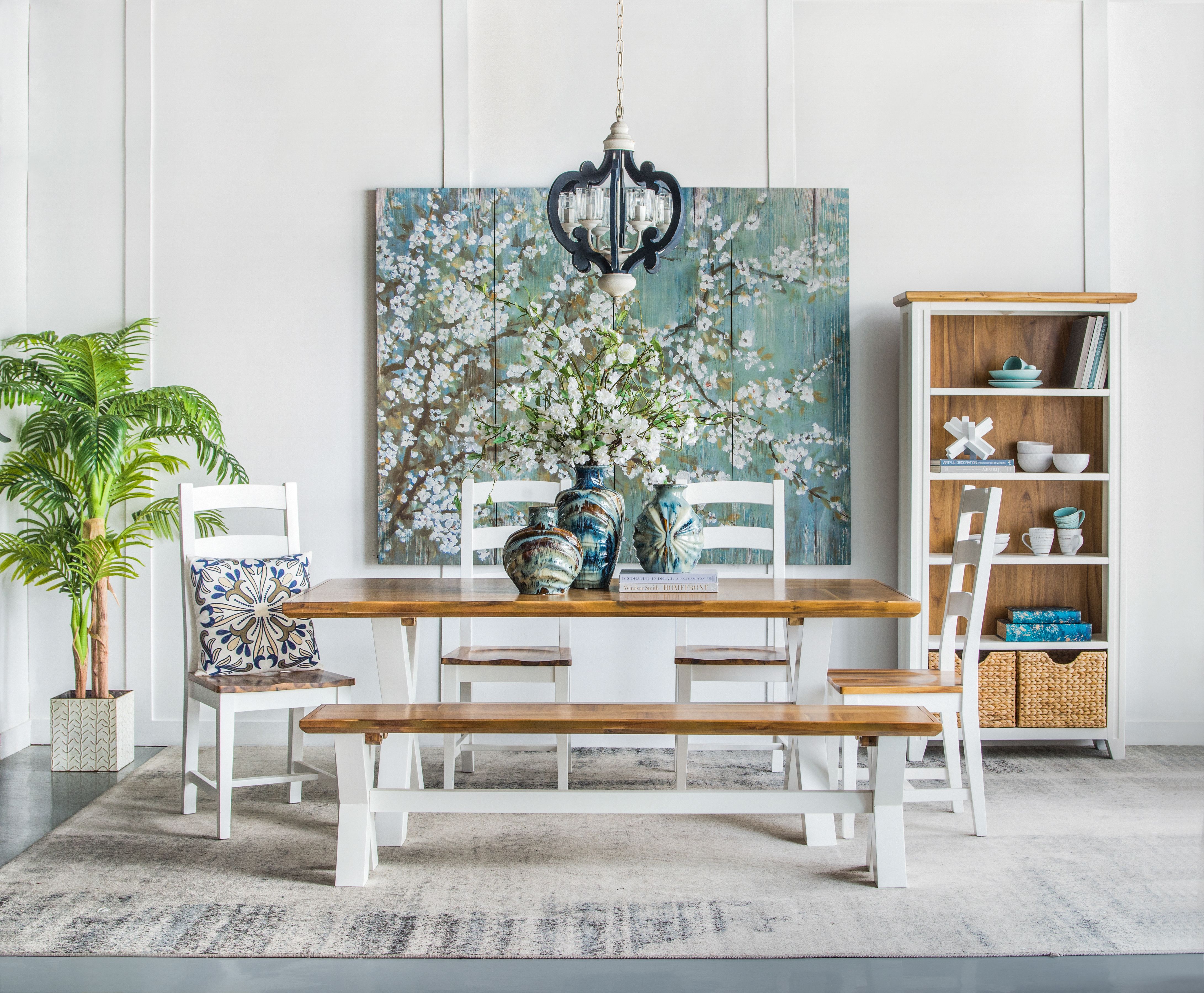 Blue wooden chandelier with white accents