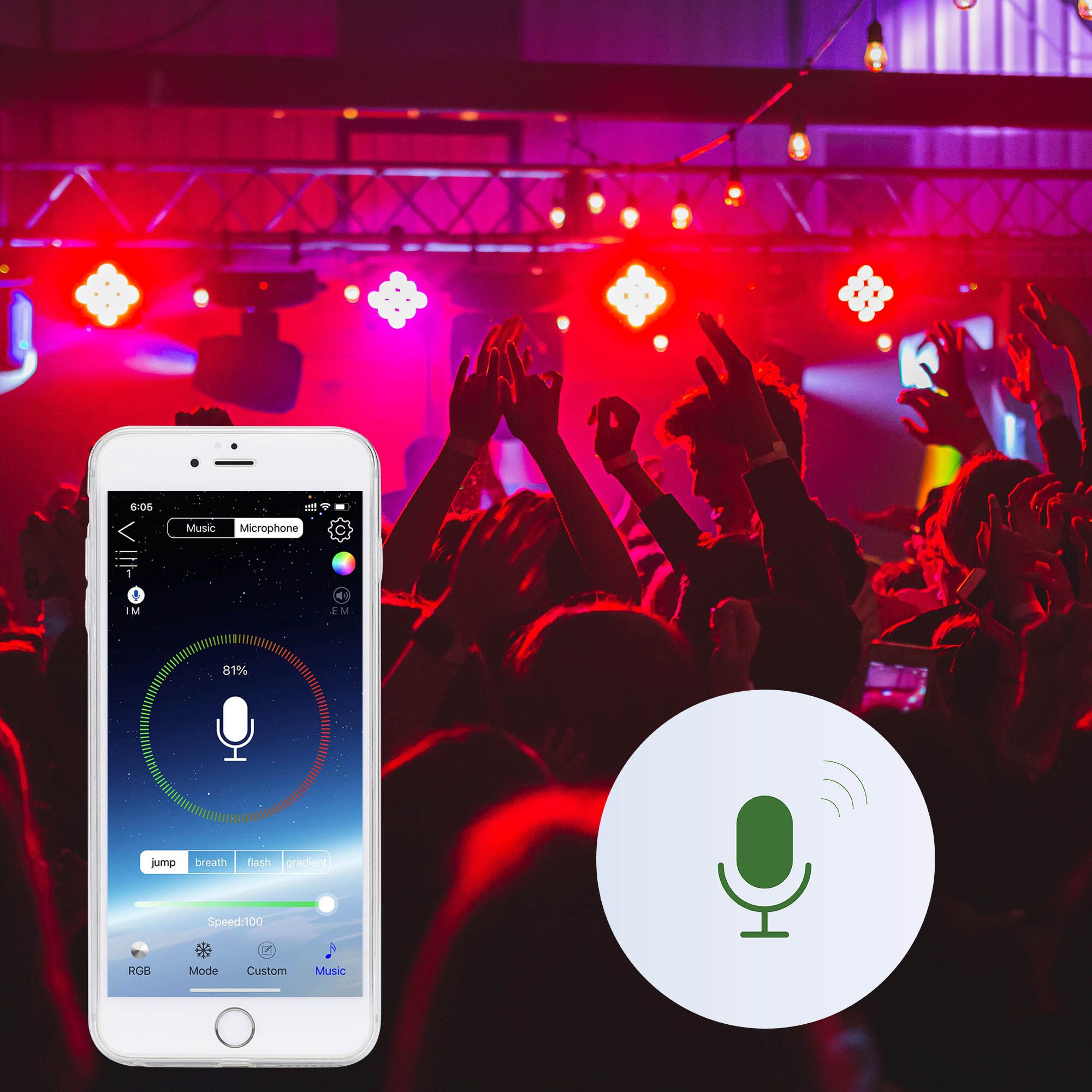 - Music Sync Color Changing - Built-in sensitive microphone to pick up the sound and enable color changing dynamically with rhythm of music, ready to boost party ambience while bringing you an immersive visual-audio experience