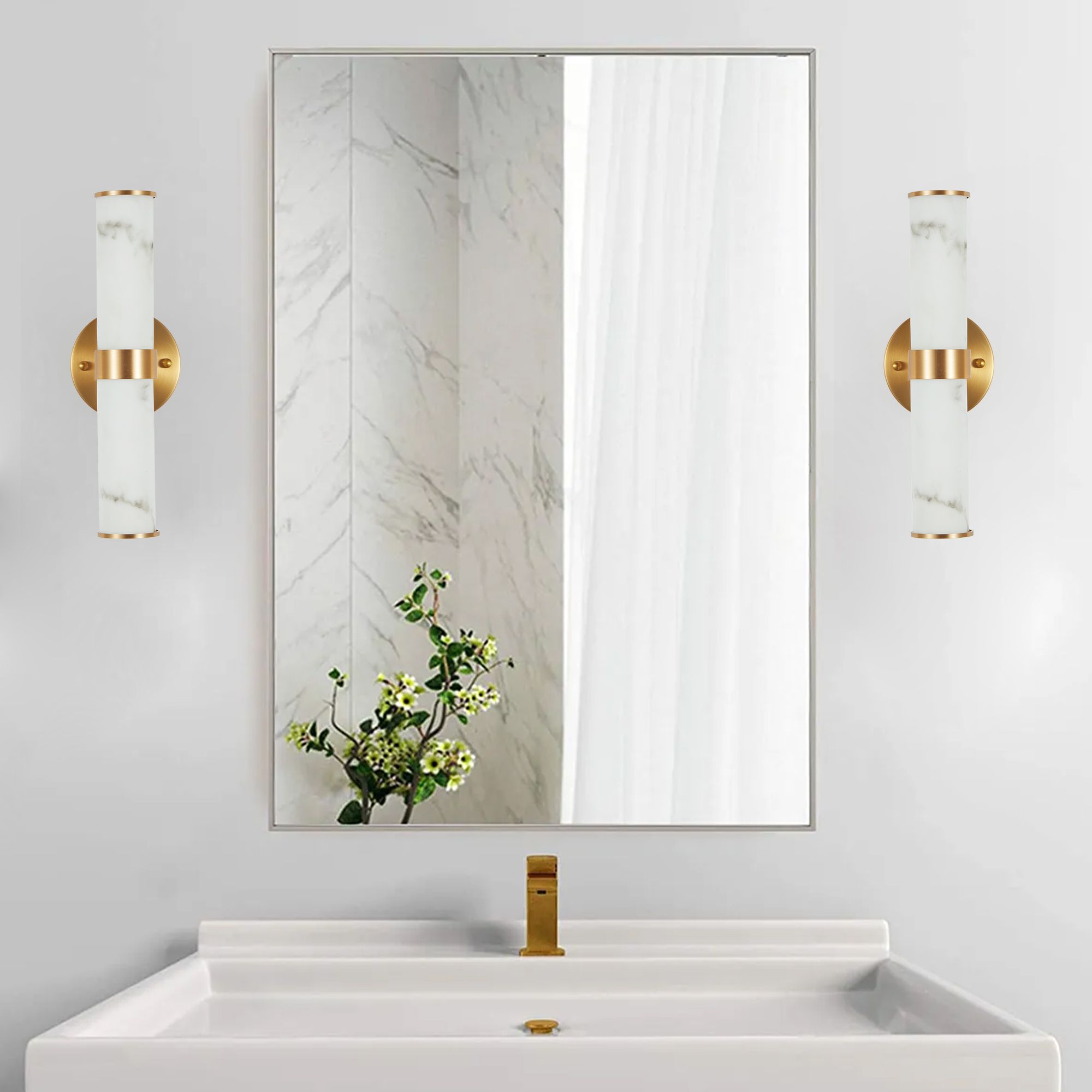 Golden and Elegant Resin Wall Sconce,Set of 2,Modern Vertical Light Fixture for IndoorDiscover the perfect blend of style and functionality with our Set of 2 Elegant Resin Wall Sconces. The feature a unique marble finish, mimicking the natural beauty of real stone with the durability and lightweight properties of high-quality resin. Accented with a touch of gold, these cylindrical light fixtures add a hint of luxury to any room. Ideal for enhancing the ambiance in your living room, bedroom, or hallway, they provide both effective illumination and a striking decorative touch. Simple to install and easy to maintain, these sconces are an effortless way to elevate your home decor while embracing eco-friendly lighting solutions.