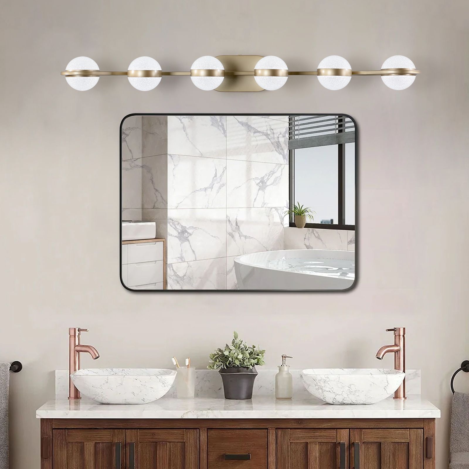 [MODERN&ELEGANT DESIGN]:Premium Transparent Lampshades more brilliance to your life,simple and luxurious design makes it durable decoration for your home.Inspired by a playful slingshot toy, each fixture features globe lights in a fun Mid-century Modern arrangement. [APPLICATION]: 6 Lights bathroom Vanity Lighting. Modern and simple style design, suitable for your bathroom, mirror cabinets,powder room, bedroom and living room etc. Modern vanity light brightens your living instantly. [ENERGY SAVING]:LED Light Sourcecreates stable and efficient light.LED technology saves up to 80% electricity [Finish]: Champagne Gold [Height centre of Wall Opening]: 2.6 Inch [Material]: Acrylic [ Average Hours]: Integrated soft white (6000K) light