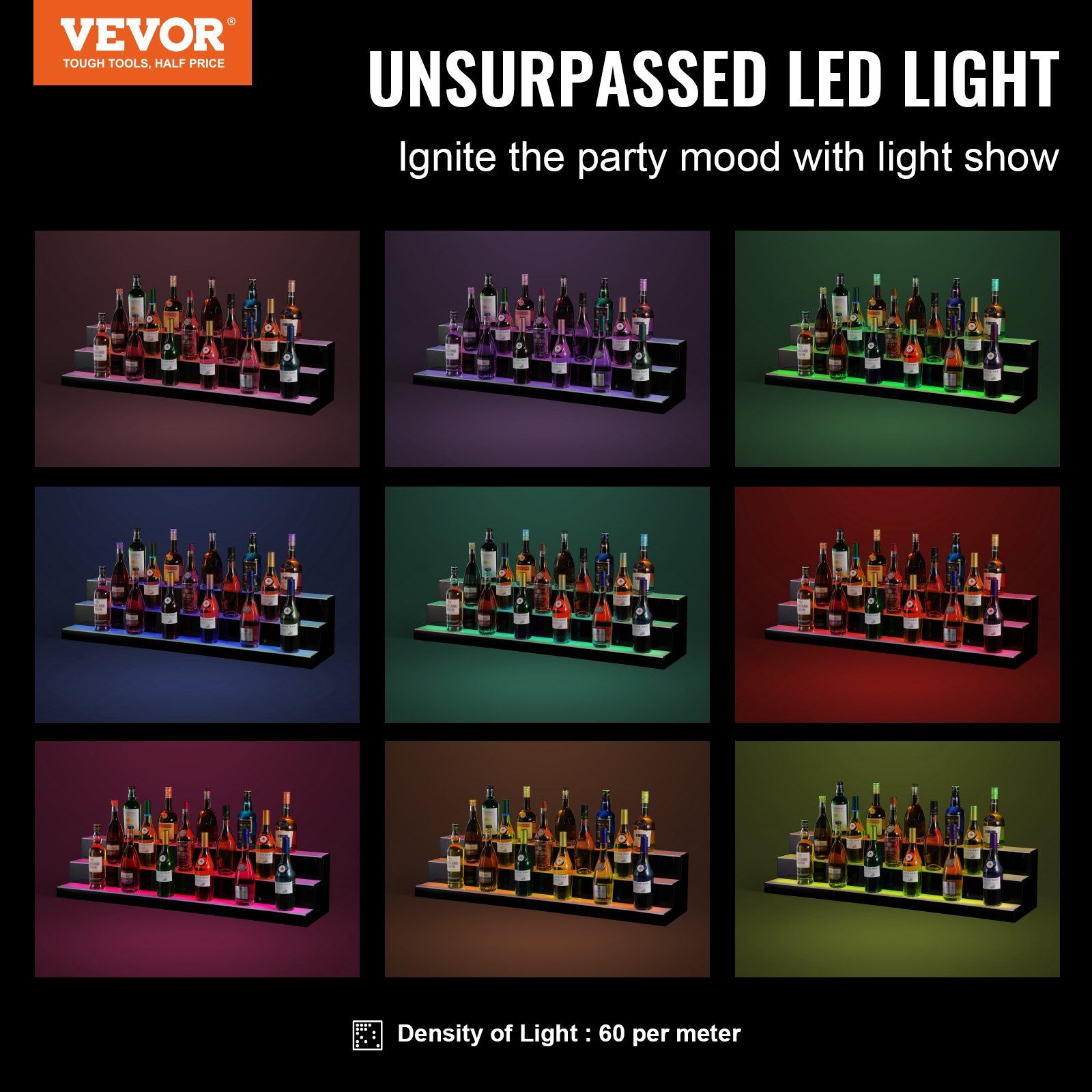 Highlights: 1.Spotlight your Bar: Prepare to be dazzled by an upgraded LED light effect and leave your guest speechless. 60 lamp beads per meter is sure to create a night to remember. Given the superb lighting performance, it is no surprise that our led lighted bar shelf display can create a brighter ambiance for any bar. 2.Control Freely within 26Ft: Are you tired of confusing settings and adjustments? With our bar lights you are in control! Supported by RF remote and smart app control, you can adjust effects as you like, including 7 static colors, 22 dynamic colors, multiple DIY modes, music modes, and 1-4h timing. Moreover, multiple bar shelves can be simultaneously controlled under a single remote control. 3.Power up and Keep the Party Going: No matter where the party is, our lighted liquor bottle shelf never run out of power. They can be powered by a 110-240V power adapter and a laptop/power bank. Let the party live on! Due to two power supply methods, our product can satisfy indoor and outdoor activities. Charge up, party, and live it up till the sun comes up. 4.Translucent Acrylic Bar Shelf: The acrylic material has been adopted by our bottle display to feature vibrant colors and an expanded capacity. Besides, the polished surface is waterproof and easy to clean. Make this liquor shelf a unique addition to your bar, and get ready to live life to the fullest! 5.Make any home or bar stand out: This led lighted bar shelf creates a fun ambiance and grabs your guests' attention. Not only applicable in your home, but this product is also suitable for public areas such as commercial bars, clubs, KTV, pool parties, etc.