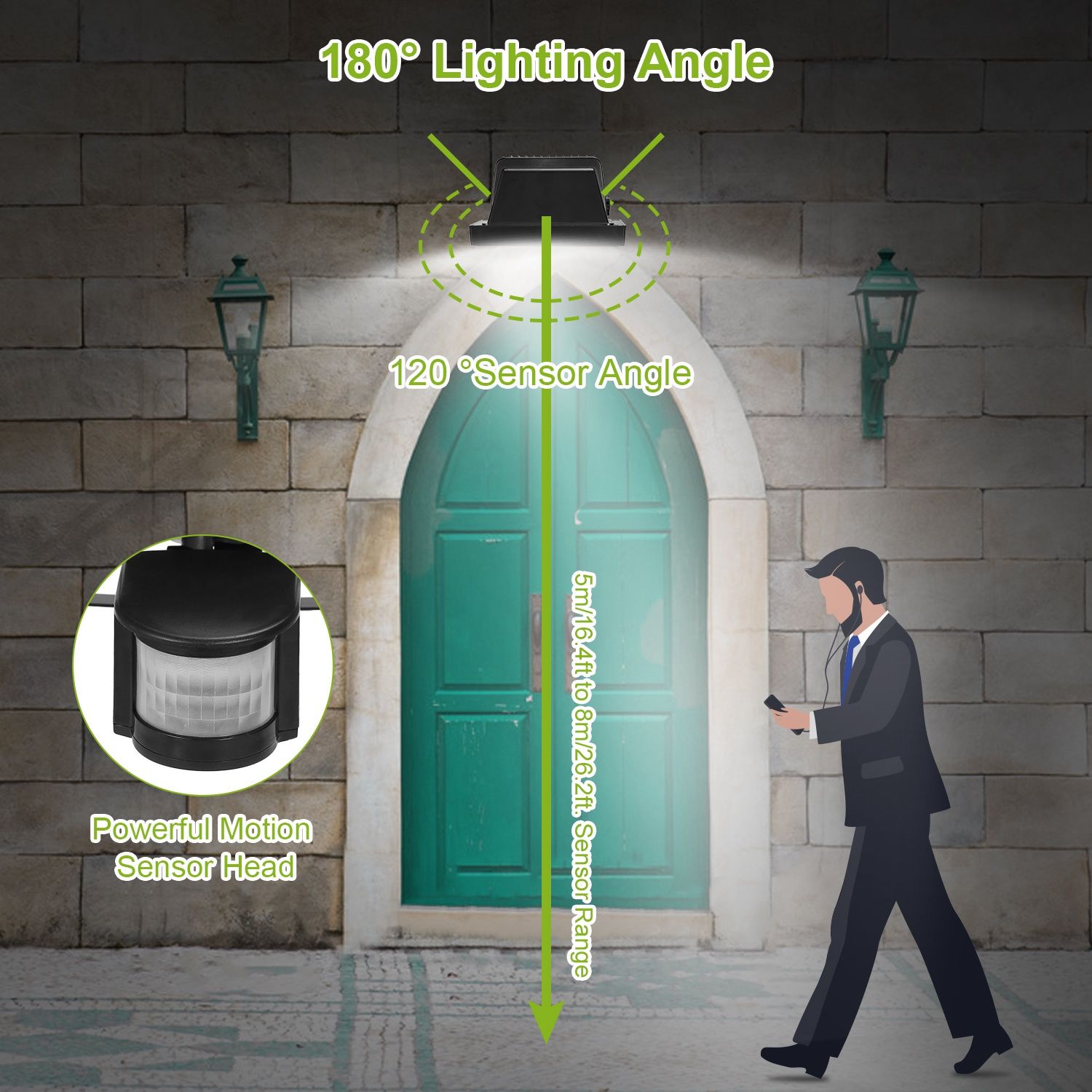 **120 LEDs Ultra-Bright Solar Powered Lights*:Inbuilt bright 120 SMD2835 LEDs with 900lm maximum output and sensitive motion sensor with 120° wide sensing angle which provide up to 180° illumination range and turn the dark space into a bright lighted space for security and safety protection.