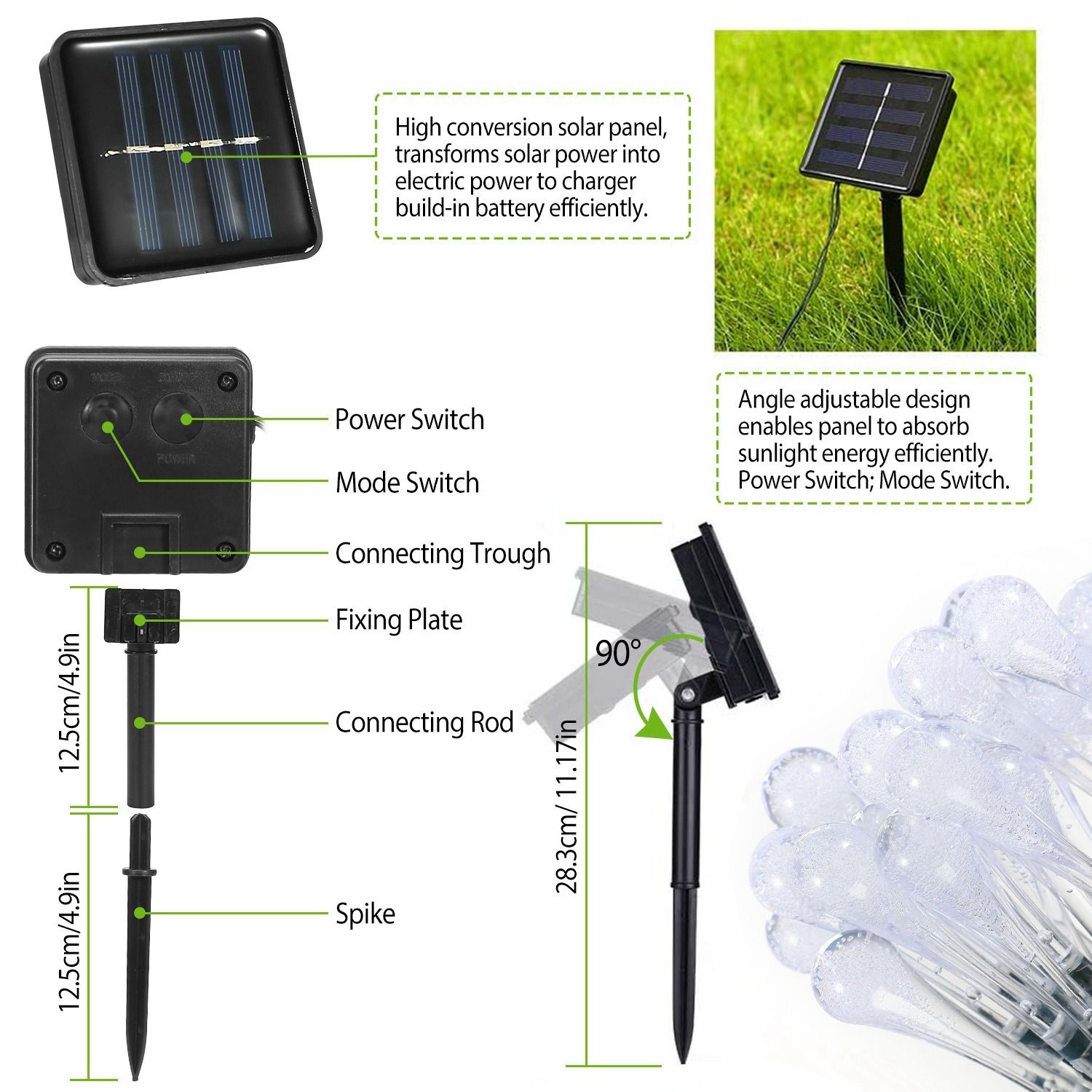 *Cost-saving Solar Powered*:Power supplied by solar energy; no extra electricity cost. Adopting high-grade polysilicon solar panel with 90°angle adjustable design and built-in 600mAh Ni-MH battery; after approx. 6-8hrs charging; our string light can work about 8hrs in steady-on mode and about 15hrs in flash mode.