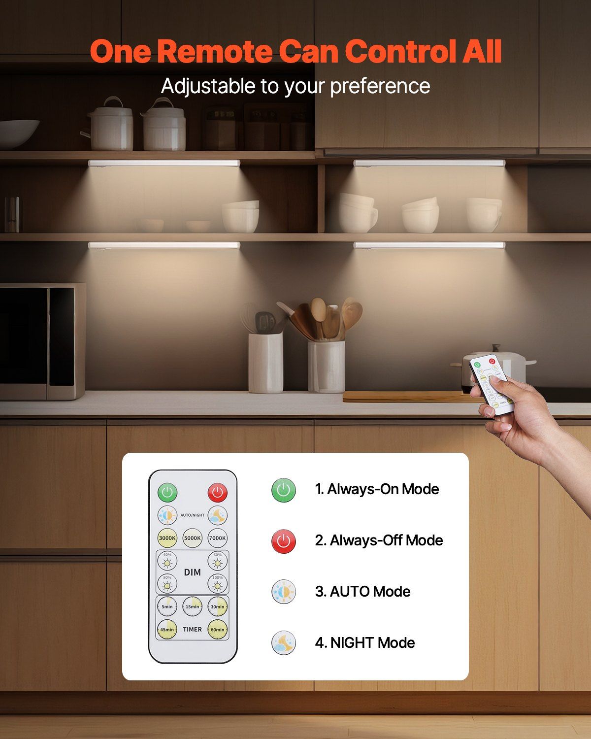 3.Dimmable & Adjustable Color Temperature: Adjust the brightness and choose from 3 color temperatures (3000K, 5000K, 7000K) to match your mood and space. Whether you're setting the vibe for a cozy kitchen or brightening up your closet, these lights are ideal for any under cabinet lighting need.