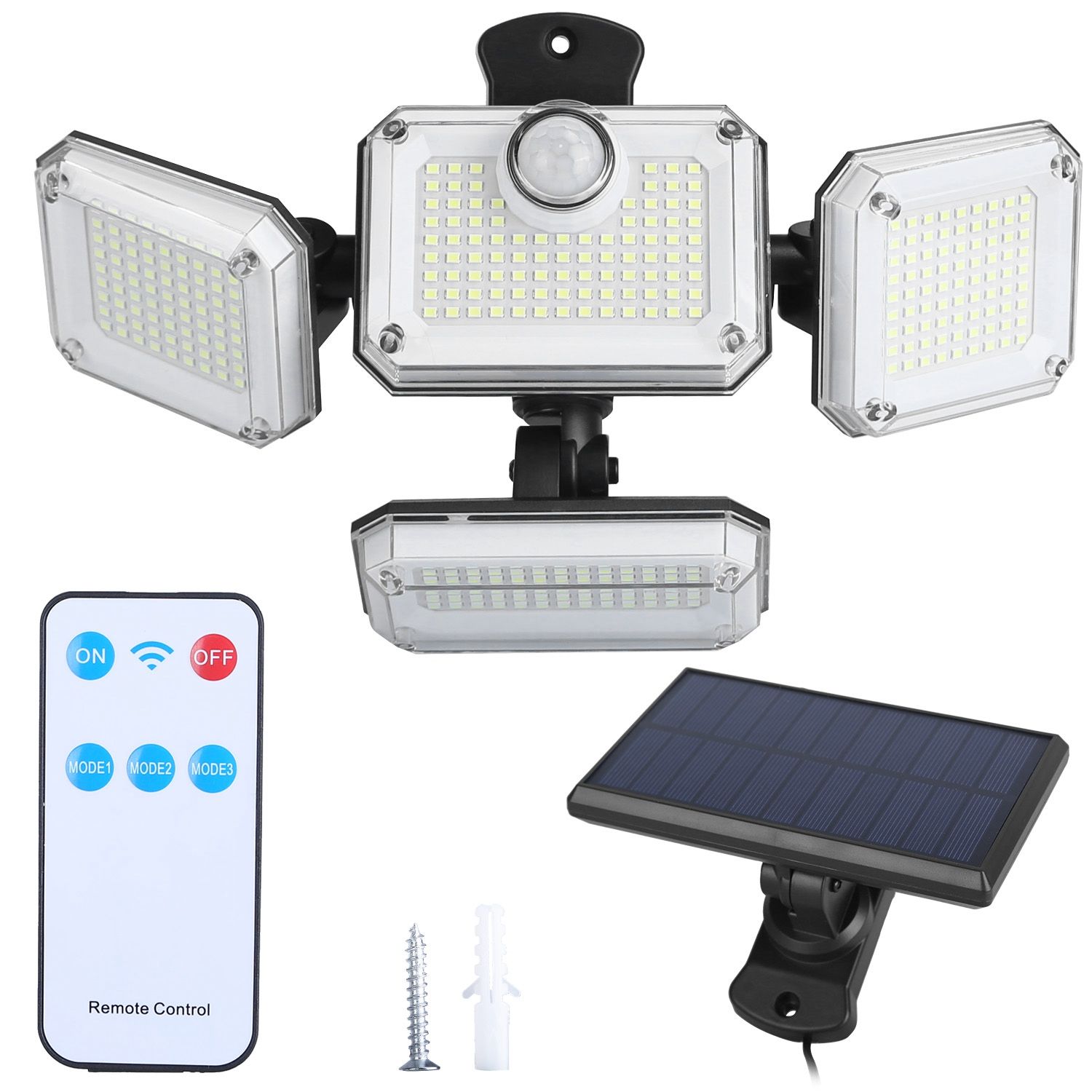 *4 Adjustable Heads & Separate Solar Panel*:The 4 adjustable heads can move up,down or horizontally,which allows you to light any angle you want. The solar panel can be adjusted at will to ensure that each angle can absorb sunlight to the maximum extent. Moreover,the separate panel is equipped with 189in long cable,which enables you to install it at different angles. The sensing angle of up to 120° and the sensing distance of 118in can provide additional brightness and a larger visible area.