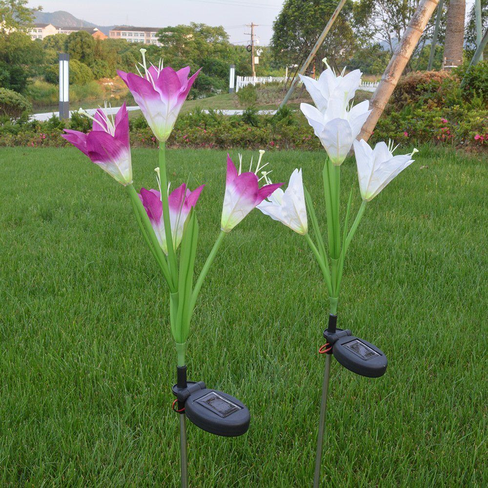 Color changing lights & Easy to Install:No wires & external electricity required. Beautiful and Graceful Lily shaped solar stake lights with color changing will automatically light up in the dark to illuminate your backyard and pathway. Perfect as path light and in-ground light, suitable to be planted near Trees, Flowerbed, Fence and Walkway etc.